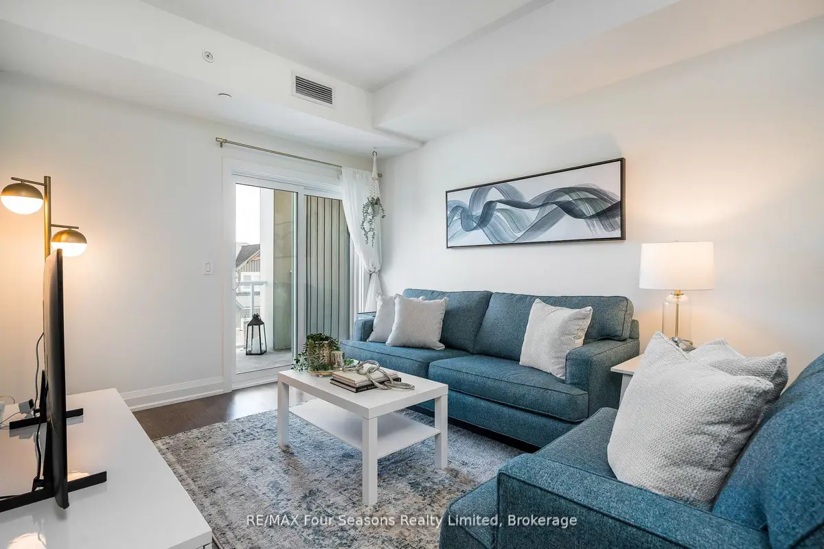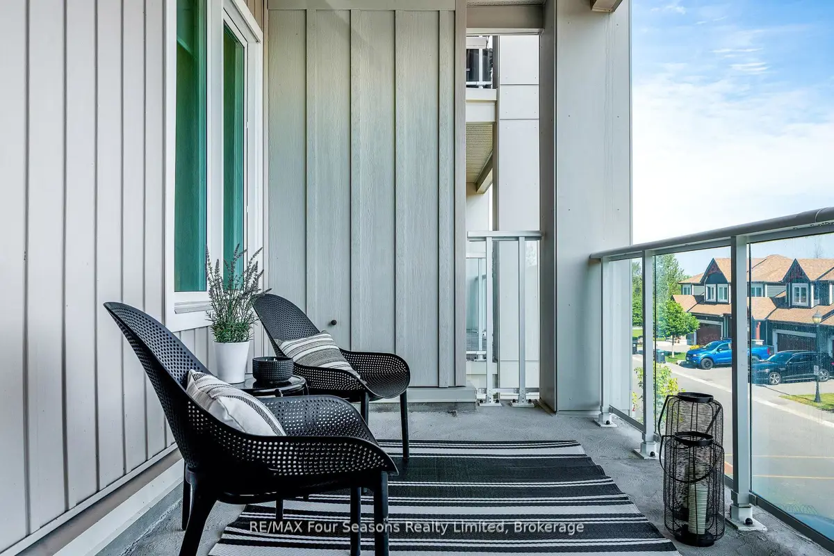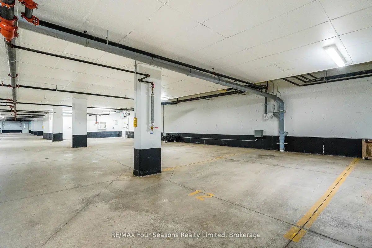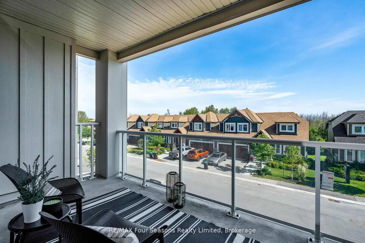 BRAND NEW CONDO AT THE VIEW Blue Fairways with UNDERGROUND PARKING! Move-in ready and just completed, this beautifully upgraded Condor floorplan offers over $20K in upgrades and stylish open-concept living. Enjoy a generous 17 x 8 covered balcony with sleek glass railings and a gas BBQ hookup perfect for entertaining or unwinding outdoors. Located in the sought-after View development within Cranberry Golf Course, this unit showcases high-end finishes including laminate and tile flooring, 9 ceilings, and granite countertops in both the kitchen and ensuite. The luxurious ensuite also features a modern glass walk-in shower. The gourmet kitchen is equipped with a gas range, stainless steel appliances, stone counters, and ample cabinetry ideal for cooking and hosting. Additional highlights include; Gas heating & central air, In-suite laundry closet, Large storage locker just outside your front door, and One assigned underground parking space. Enjoy a prime location with direct access to the Georgian Trail, and just steps to shops, restaurants, and cafes. Only 5 minutes to downtown Collingwood, ski hills, beaches, and golf courses all nearby perfect for year-round living or weekend escapes. Condo fees include garbage removal, and a brand new pool, fitness center, and playground exclusively for The View residents.
