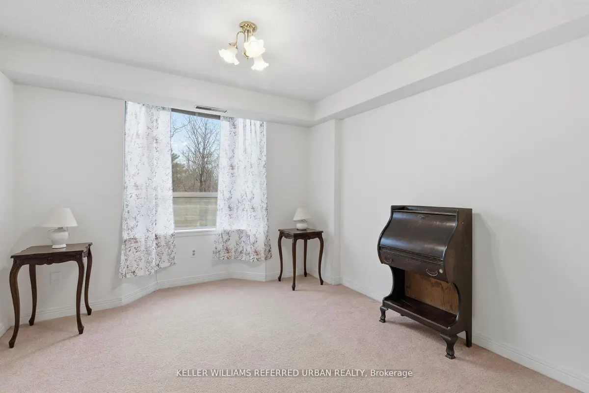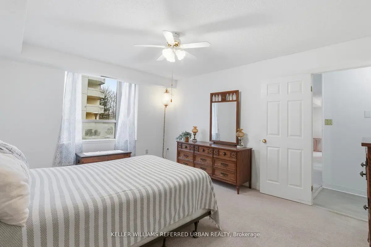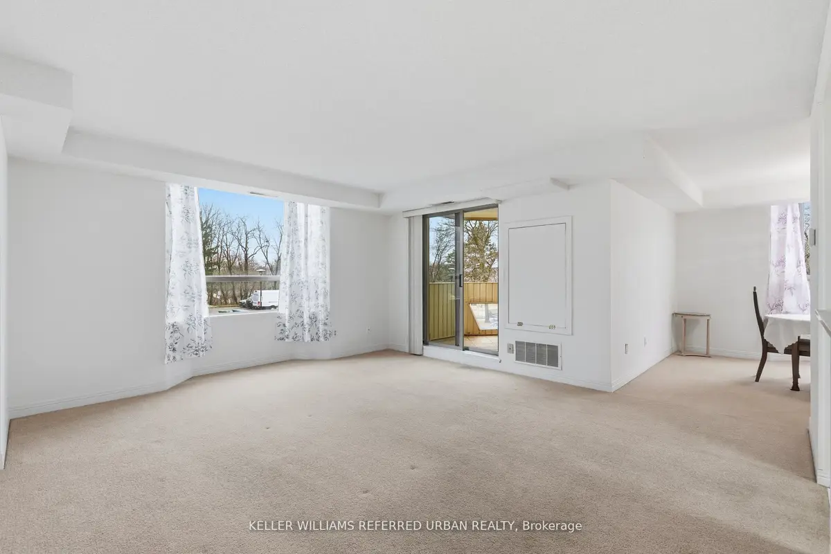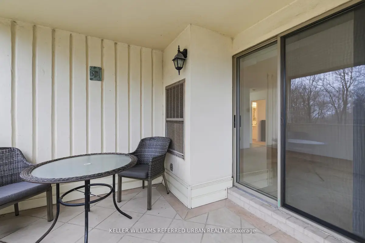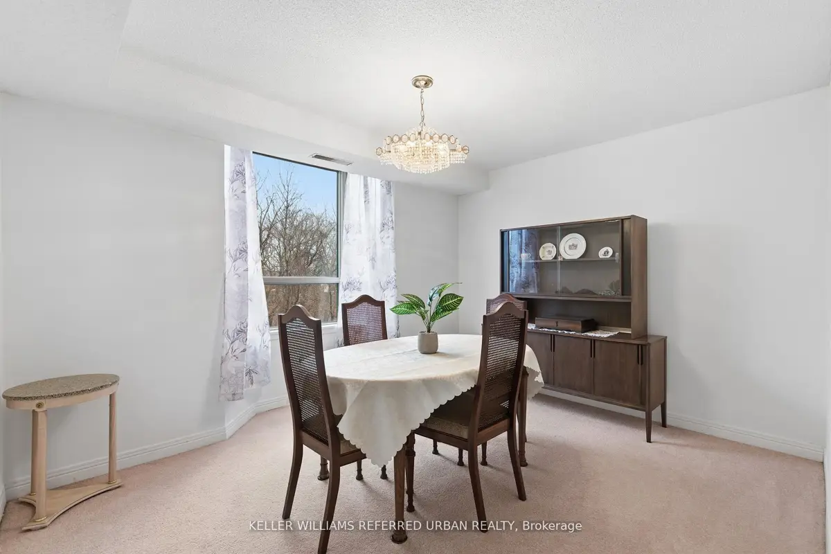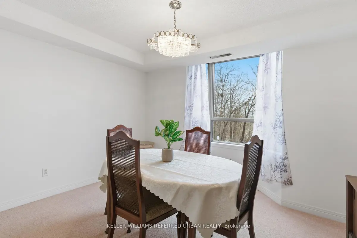 Welcome to 8 Village Green, Stoney Creek, located in Stoney Creek's historic and charming downtown King Street area with quaint shops and restaurants. This well-maintained condominium apartment offers comfortable and spacious living (approx. 1200 sf) in a desirable, wellmanaged community, popular with seniors and downsizers. Featuring 2 oversized bedrooms and 2 full bathrooms, a separate dining room for entertaining, and a bright and roomy living area with walk-out to a private balcony large enough for a patio set: this home is ideal for relaxed everyday living and great for someone who wants a smaller space and no snow to shovel! Residents enjoy excellent building amenities including a workshop, library, exercise room, and party room with kitchen area. Convenient underground parking spot right near the elevator entry. Located close to shopping, parks, transit, major highway access, Centennial Parkway, The Battlefield House and Park, Devil's Punchbowl and waterfall, and the Bruce Trail . The suite overlooks the back of the building where there is serene greenspace and trees for privacy. Absolutely ideal for downsizers who still want space and a separate dining area, first-time buyers who want a large condo, or anyone seeking lowmaintenance, easy and enjoyable condo living. Lovingly cared for and maintained the condo has been freshly painted with new modern laminate floors in the hallways (2026).