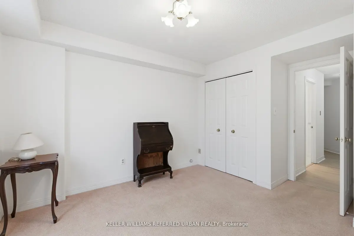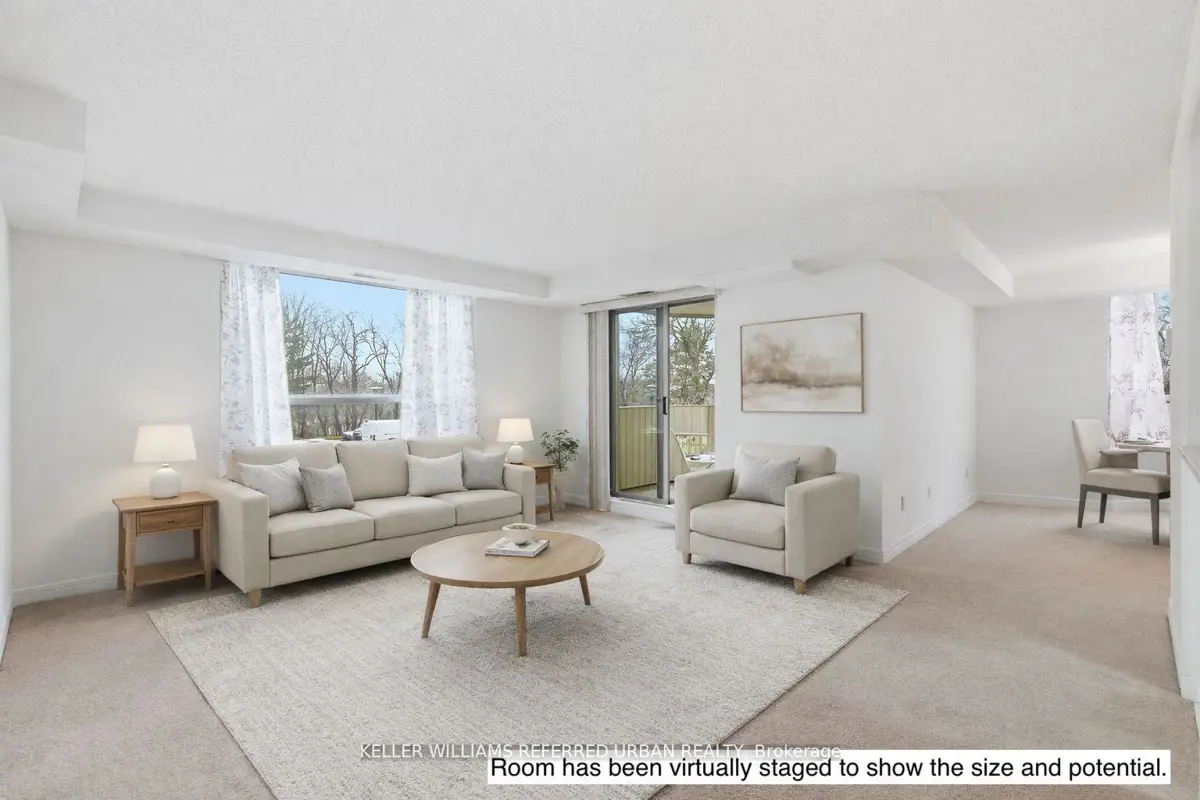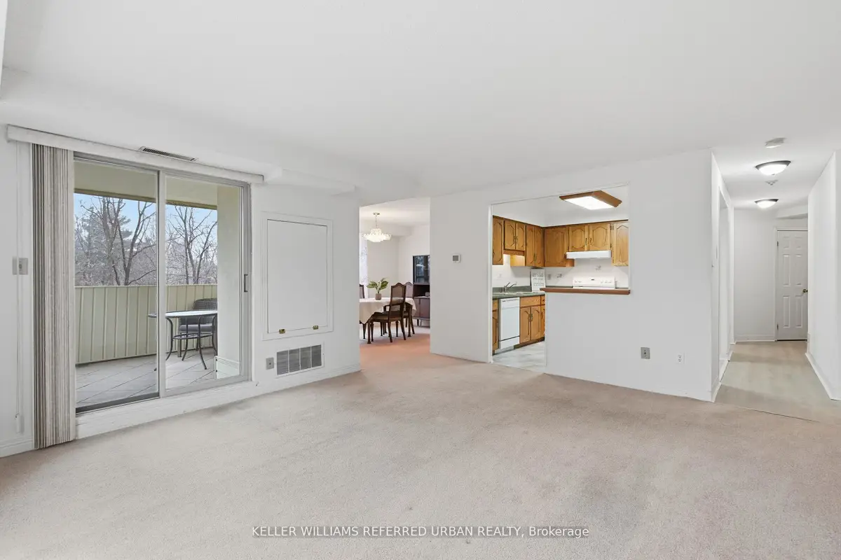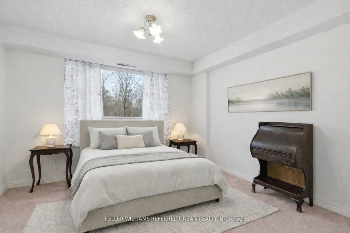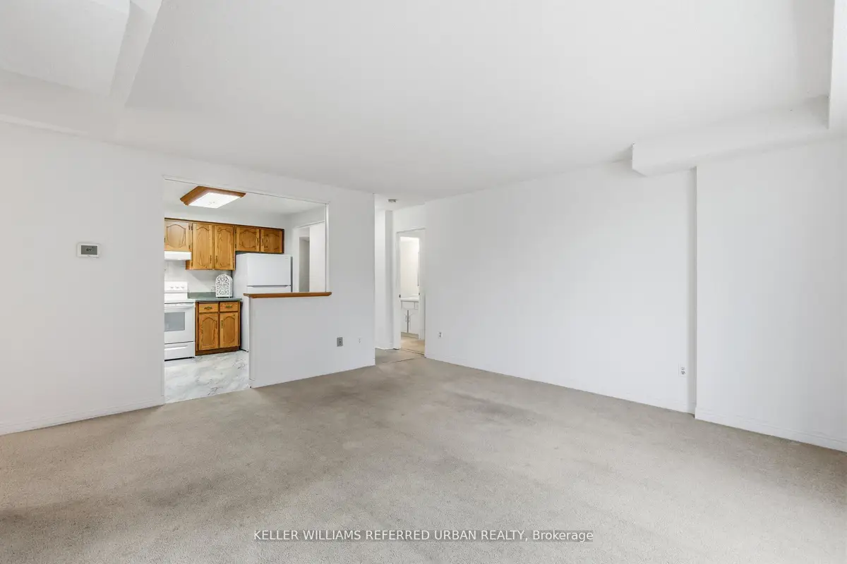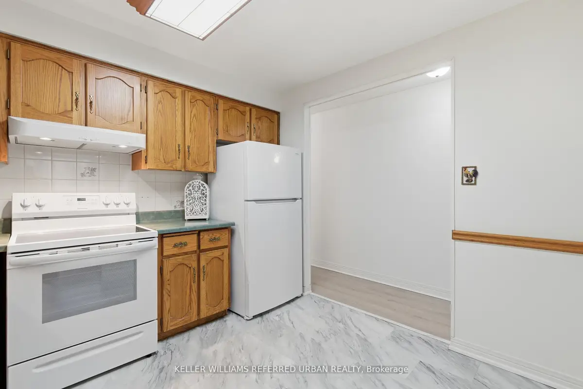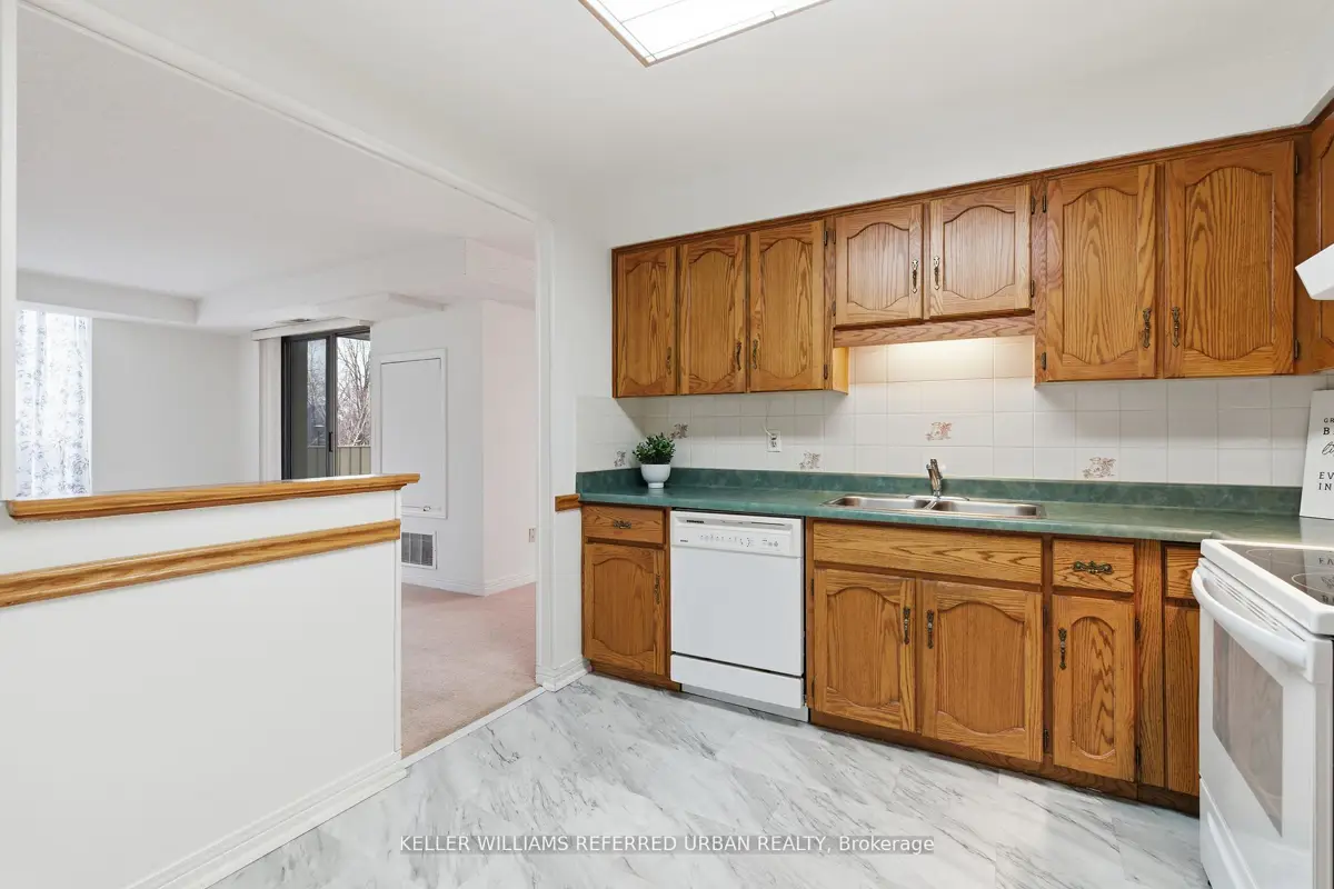 Welcome to 8 Village Green, Stoney Creek, located in Stoney Creek's historic and charming downtown King Street area with quaint shops and restaurants. This well-maintained condominium apartment offers comfortable and spacious living (approx. 1200 sf) in a desirable, wellmanaged community, popular with seniors and downsizers. Featuring 2 oversized bedrooms and 2 full bathrooms, a separate dining room for entertaining, and a bright and roomy living area with walk-out to a private balcony large enough for a patio set: this home is ideal for relaxed everyday living and great for someone who wants a smaller space and no snow to shovel! Residents enjoy excellent building amenities including a workshop, library, exercise room, and party room with kitchen area. Convenient underground parking spot right near the elevator entry. Located close to shopping, parks, transit, major highway access, Centennial Parkway, The Battlefield House and Park, Devil's Punchbowl and waterfall, and the Bruce Trail . The suite overlooks the back of the building where there is serene greenspace and trees for privacy. Absolutely ideal for downsizers who still want space and a separate dining area, first-time buyers who want a large condo, or anyone seeking lowmaintenance, easy and enjoyable condo living. Lovingly cared for and maintained the condo has been freshly painted with new modern laminate floors in the hallways (2026).