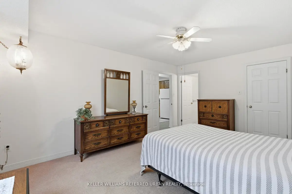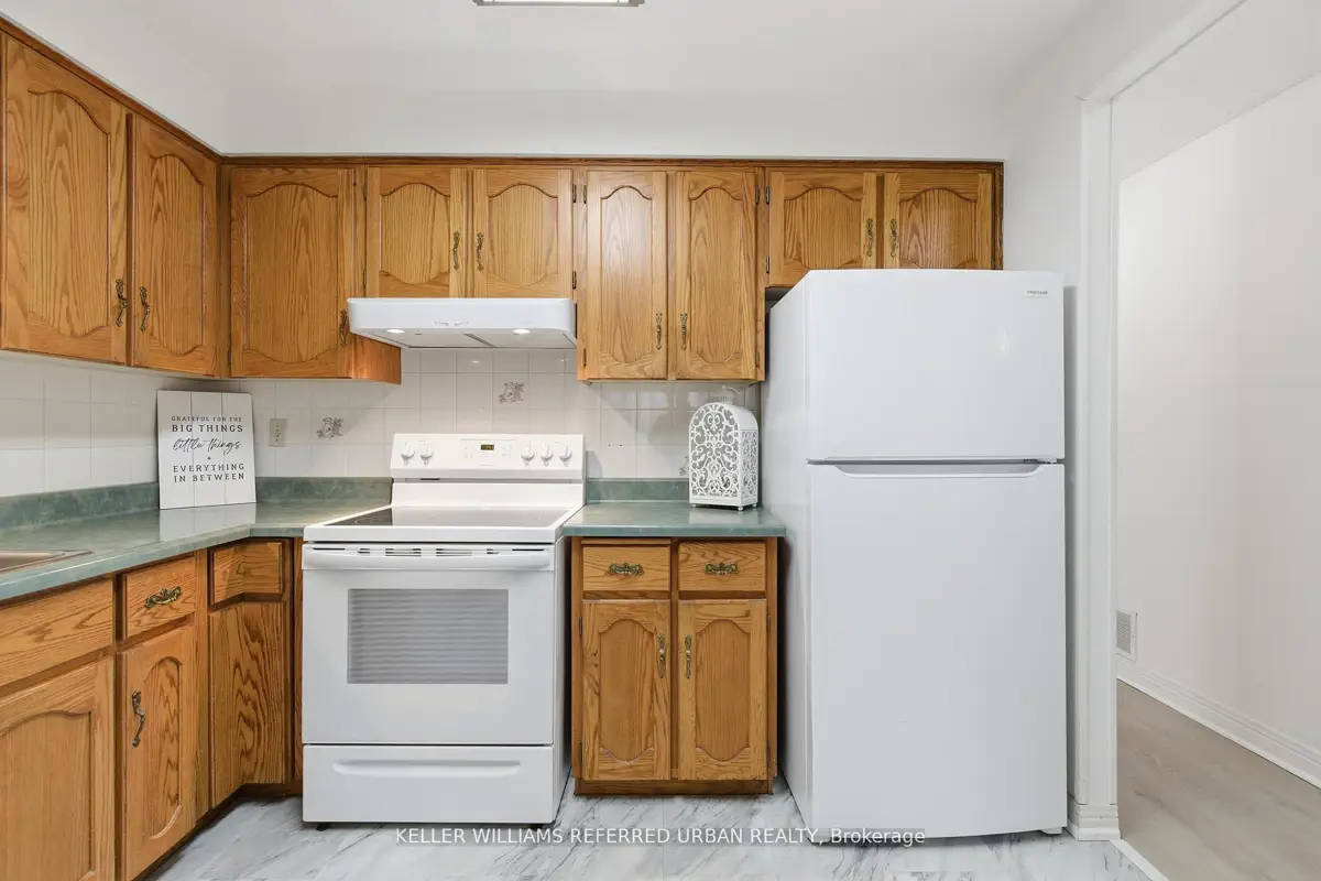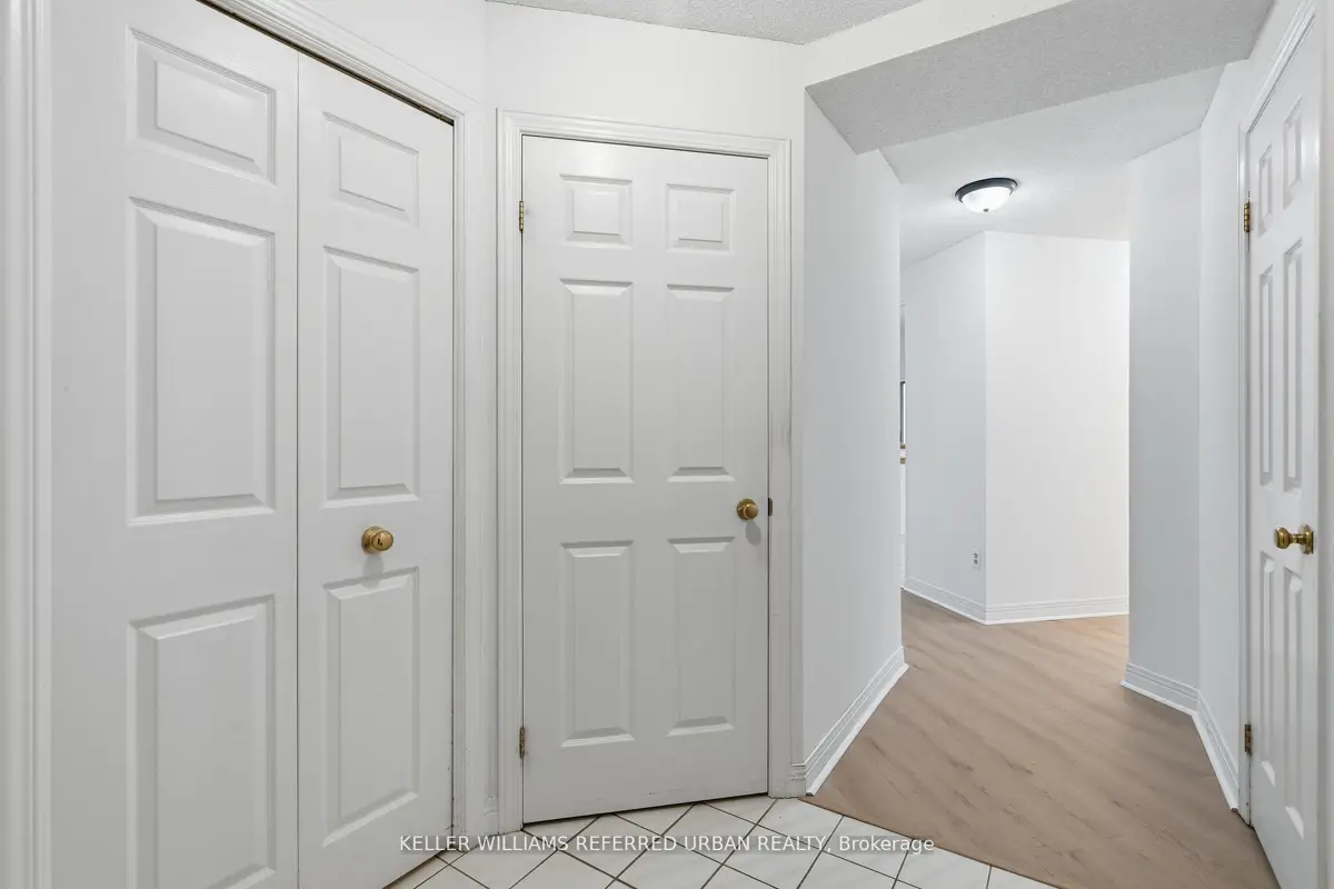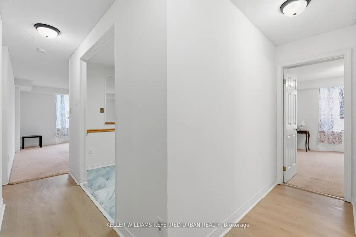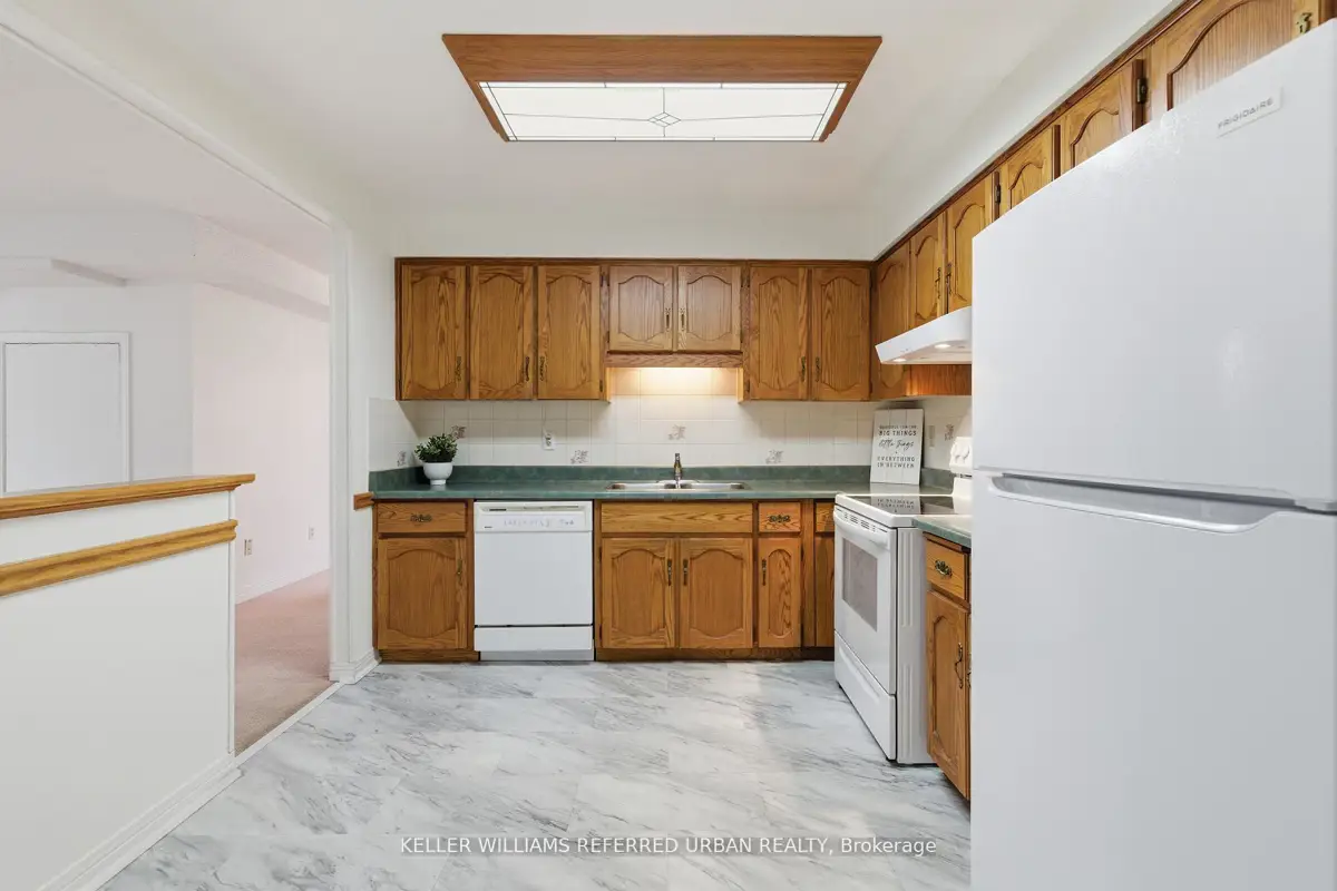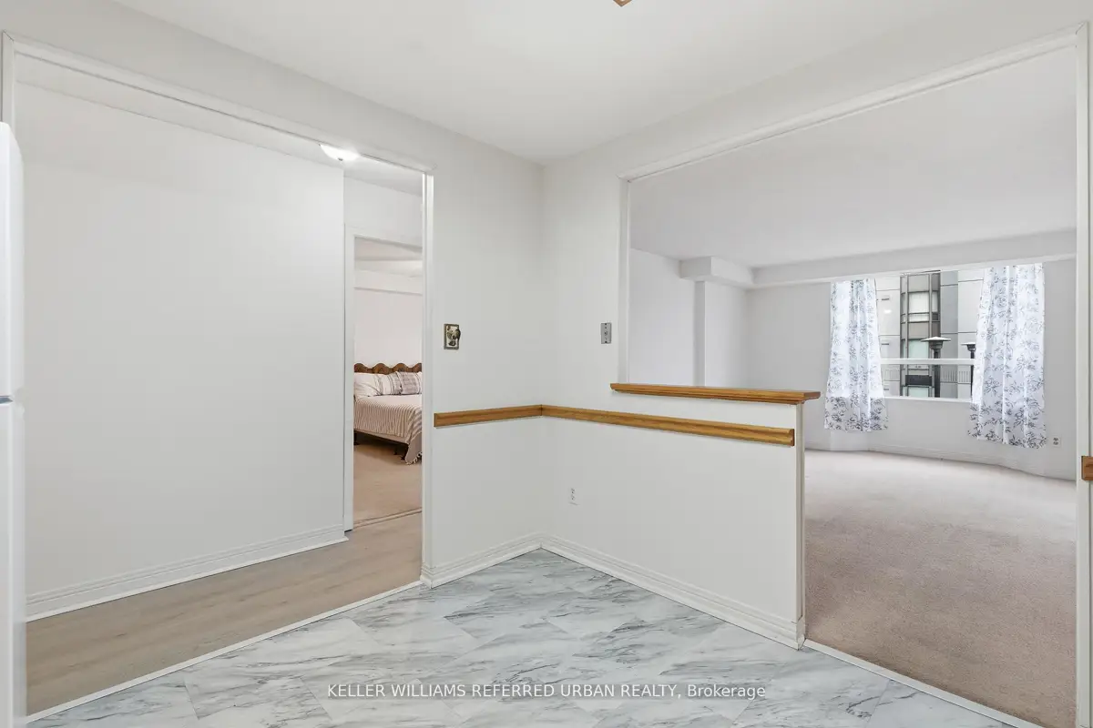 Welcome to 8 Village Green, Stoney Creek, located in Stoney Creek's historic and charming downtown King Street area with quaint shops and restaurants. This well-maintained condominium apartment offers comfortable and spacious living (approx. 1200 sf) in a desirable, wellmanaged community, popular with seniors and downsizers. Featuring 2 oversized bedrooms and 2 full bathrooms, a separate dining room for entertaining, and a bright and roomy living area with walk-out to a private balcony large enough for a patio set: this home is ideal for relaxed everyday living and great for someone who wants a smaller space and no snow to shovel! Residents enjoy excellent building amenities including a workshop, library, exercise room, and party room with kitchen area. Convenient underground parking spot right near the elevator entry. Located close to shopping, parks, transit, major highway access, Centennial Parkway, The Battlefield House and Park, Devil's Punchbowl and waterfall, and the Bruce Trail . The suite overlooks the back of the building where there is serene greenspace and trees for privacy. Absolutely ideal for downsizers who still want space and a separate dining area, first-time buyers who want a large condo, or anyone seeking lowmaintenance, easy and enjoyable condo living. Lovingly cared for and maintained the condo has been freshly painted with new modern laminate floors in the hallways (2026).