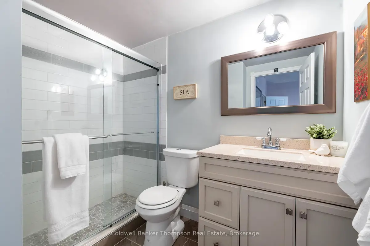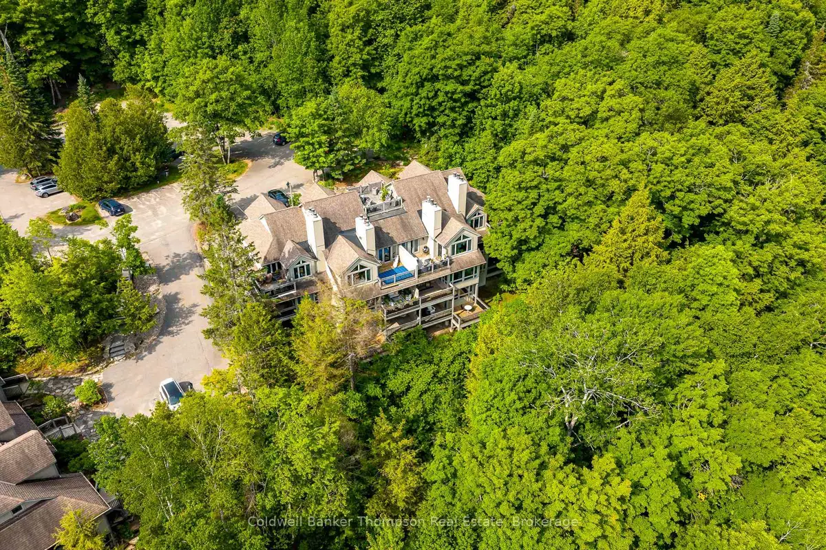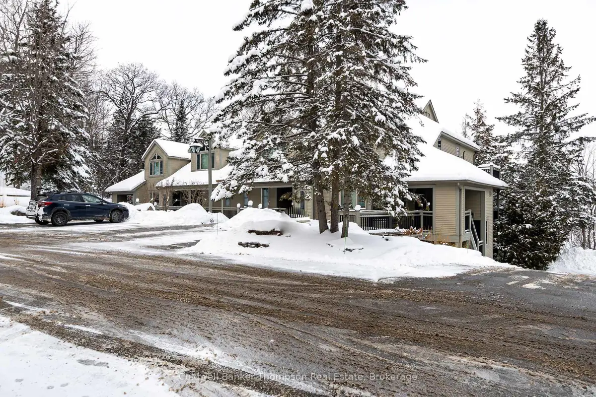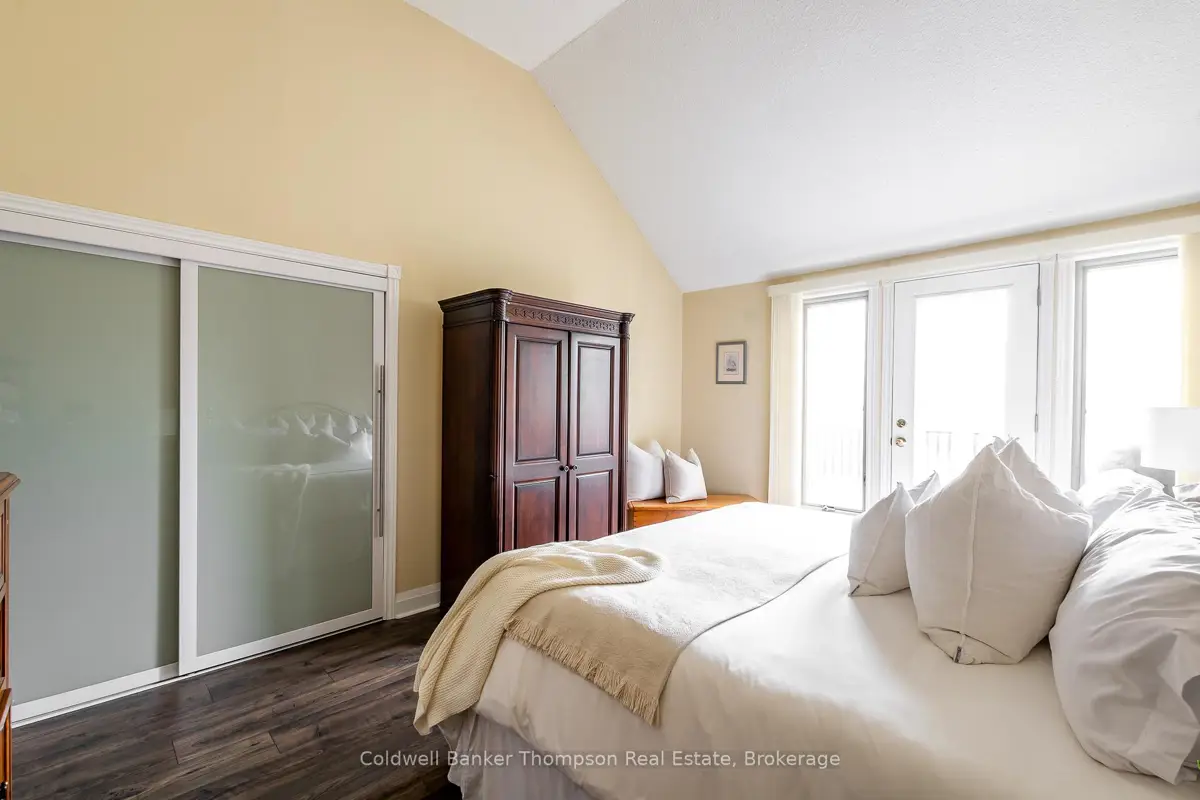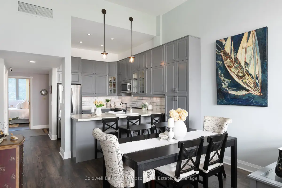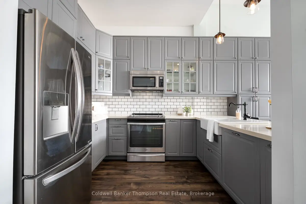 Welcome to this beautifully reimagined 2-bedroom, 2-bathroom condo that captures the essence of refined modern living. Inside you're greeted by gleaming hardwood floors that flow through most of the space, a warm invitation to explore this thoughtfully renovated gem. The kitchen is a masterpiece of design, featuring soaring ceilings that lend an airy feel, along with tall, extensive cabinetry for abundant storage. The details shine with stainless steel appliances, a dishwasher with a custom matching cupboard exterior, and sleek quartz countertops, offering both beauty and durability. A farmhouse bib-style sink and antique-inspired faucet hardware add a dash of vintage charm, balancing the contemporary aesthetic perfectly. The spacious, open-concept living area extends to a private balcony, accessible from both the living room and the primary bedroom suite, where you'll love relaxing with a coffee or taking in the peaceful surroundings. Each bedroom is designed with privacy and luxury in mind. The primary suite boasts ample closet space and direct access to the balcony, while the second guest bedroom offers a walk-in closet and a well-appointed 4-piece ensuite bathroom a perfect setup for visitors or as a secondary suite. Embrace the ease of condo living with every convenience within reach: renowned golf courses, thrilling ski hills, a local hospital, and plenty of shopping, dining, and other amenities just moments away. This unit is versatile, ideal for year-round living or as an off-water cottage retreat. Find yourself at home in a space where modern elegance, comfort, and convenience converge, making every day feel like a getaway.