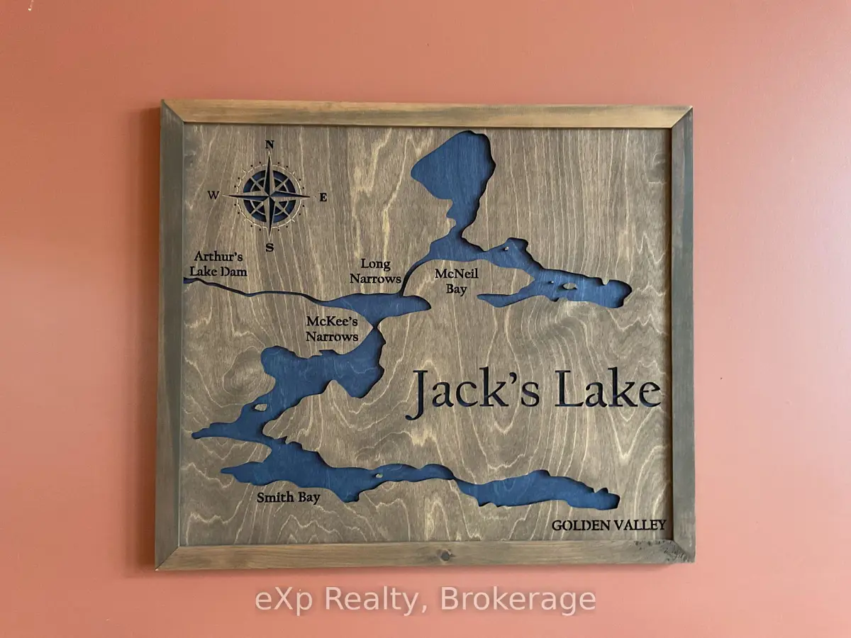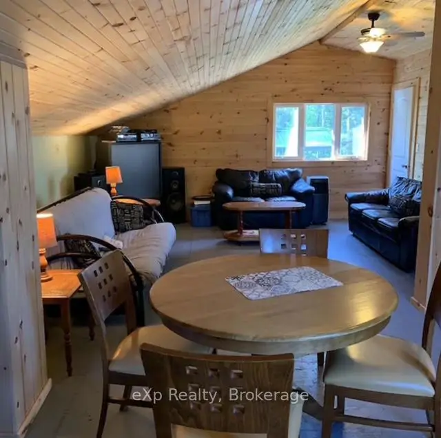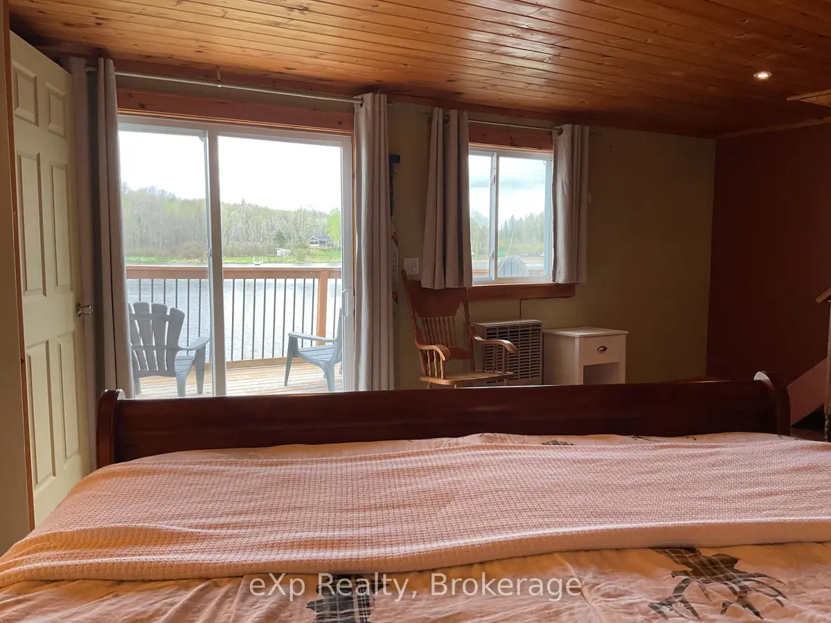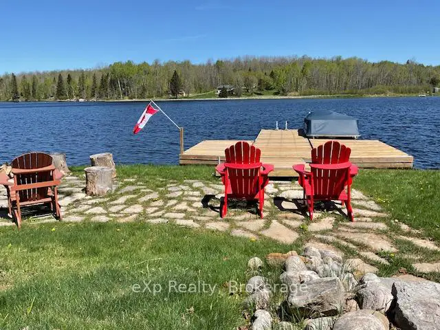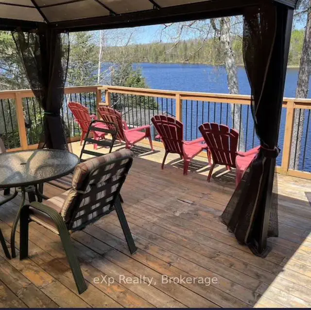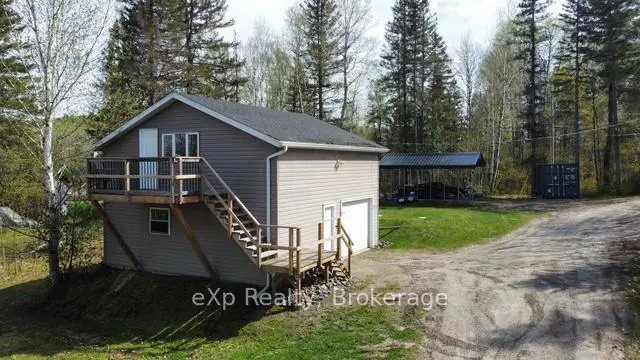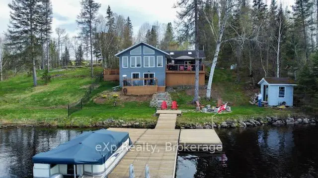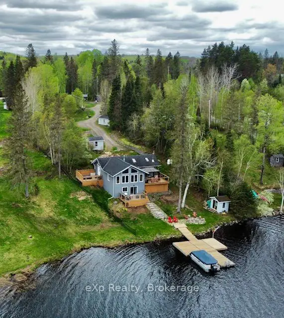 Welcome to your dream getaway on the shores of beautiful Jacks Lake! Nestled on over 3 acres in an unorganized township, this waterfront home is ready for your enjoyment. Step inside to a bright, open-concept layout featuring a spacious kitchen with a large island, ideal for cooking and entertaining. The living room boasts cathedral ceilings and stunning lake views, with French doors that open onto a large deck with a gazebo perfect for grilling or hosting guests. Just off the kitchen, another deck leads to a sunk-in hot tub- an inviting space for relaxing under the open sky. The lower-level walk-out is currently used as the primary bedroom. This suite includes a convenient 2-piece bath and patio doors leading to a private deck. It's an excellent retreat for parents or guests, offering immediate access to the outdoors, whether for a night swim or sipping your morning coffee. An oversized garage offers plenty of space for storage or hobbies, and above it you'll find additional living space with a bedroom, a 3-piece bathroom, kitchen, and sitting area ideal for guests, rental income, or extended family. Other features include a covered boat storage structure, a wood shed with hydro, a large dock, a lakeside fire pit and storage shed for quick access to your favorite water toys. Some furniture and furnishings are included. Whether you're looking for a peaceful family cottage, a rental opportunity, or a full-time residence, this move-in ready gem offers it all.