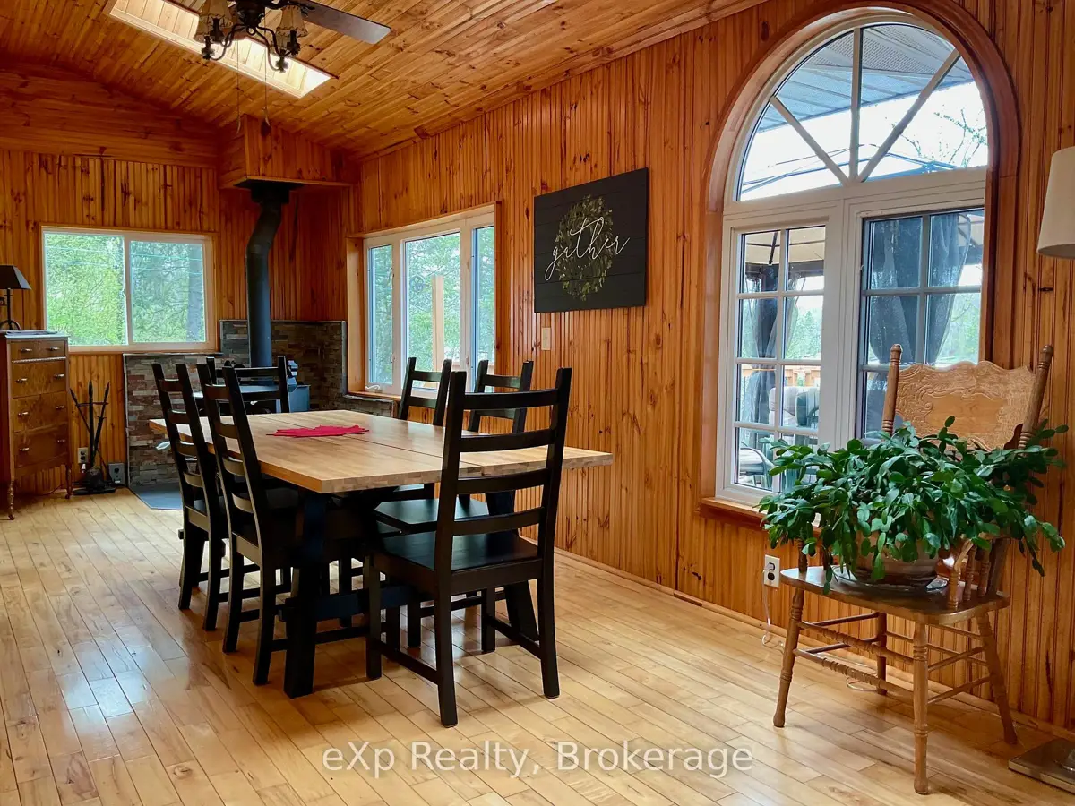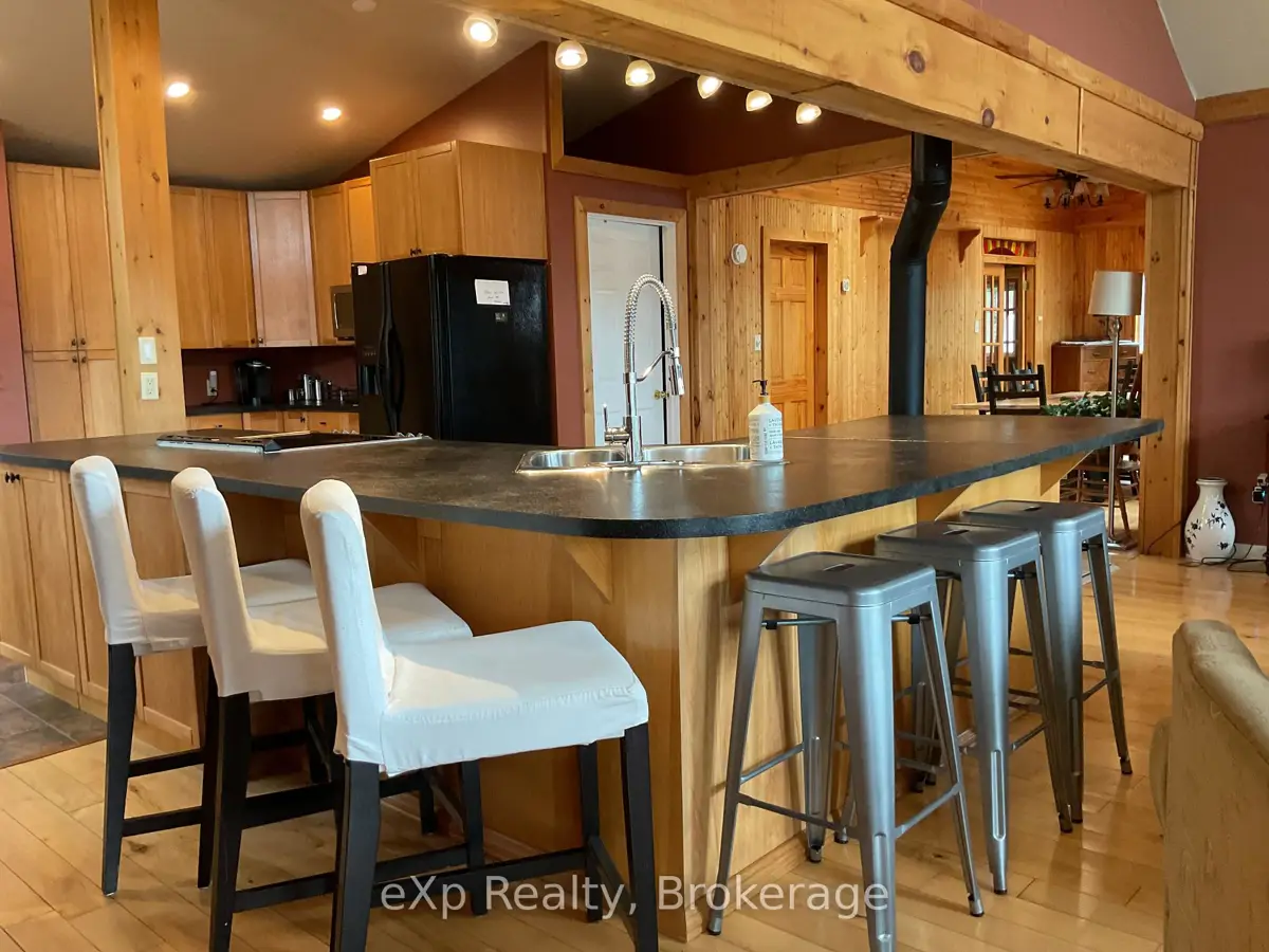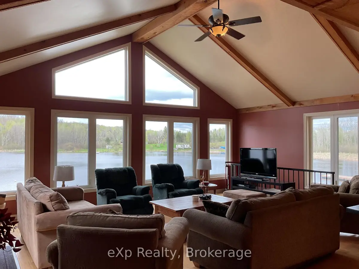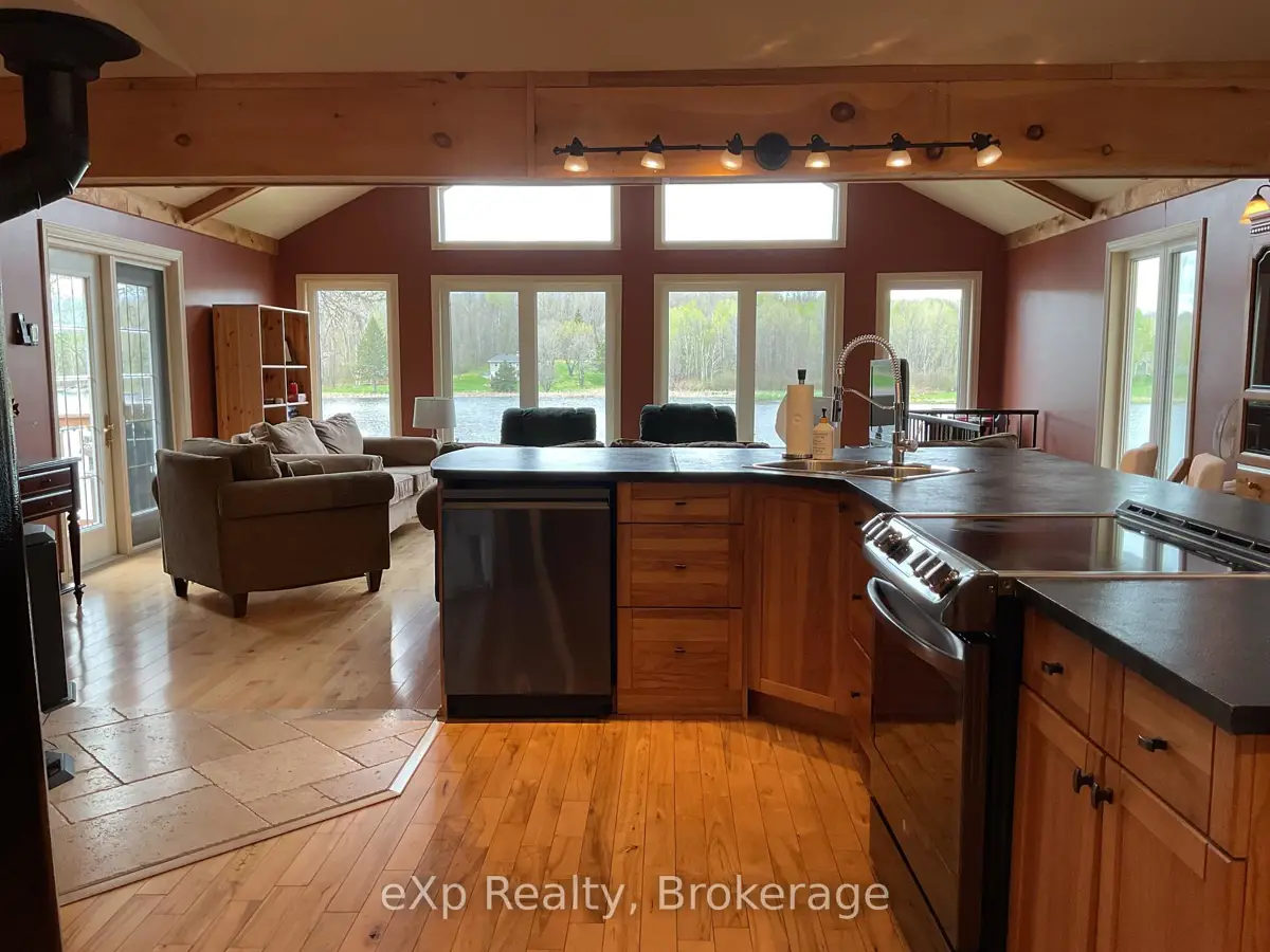 Welcome to your dream getaway on the shores of beautiful Jacks Lake! Nestled on over 3 acres in an unorganized township, this waterfront home is ready for your enjoyment. Step inside to a bright, open-concept layout featuring a spacious kitchen with a large island, ideal for cooking and entertaining. The living room boasts cathedral ceilings and stunning lake views, with French doors that open onto a large deck with a gazebo perfect for grilling or hosting guests. Just off the kitchen, another deck leads to a sunk-in hot tub- an inviting space for relaxing under the open sky. The lower-level walk-out is currently used as the primary bedroom. This suite includes a convenient 2-piece bath and patio doors leading to a private deck. It's an excellent retreat for parents or guests, offering immediate access to the outdoors, whether for a night swim or sipping your morning coffee. An oversized garage offers plenty of space for storage or hobbies, and above it you'll find additional living space with a bedroom, a 3-piece bathroom, kitchen, and sitting area ideal for guests, rental income, or extended family. Other features include a covered boat storage structure, a wood shed with hydro, a large dock, a lakeside fire pit and storage shed for quick access to your favorite water toys. Some furniture and furnishings are included. Whether you're looking for a peaceful family cottage, a rental opportunity, or a full-time residence, this move-in ready gem offers it all.