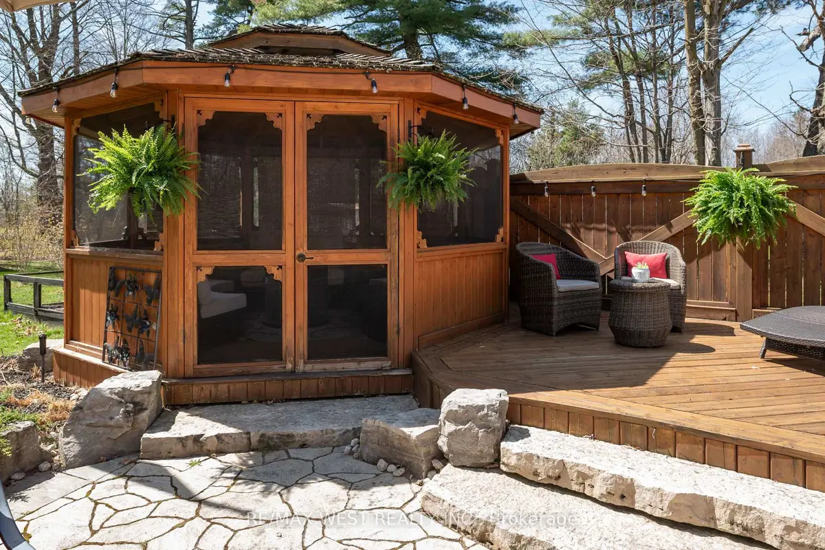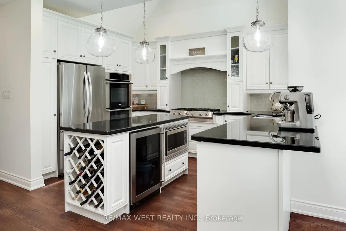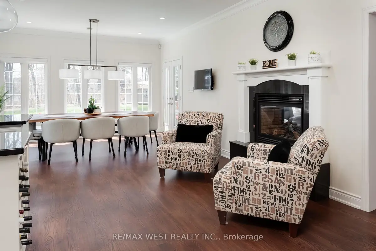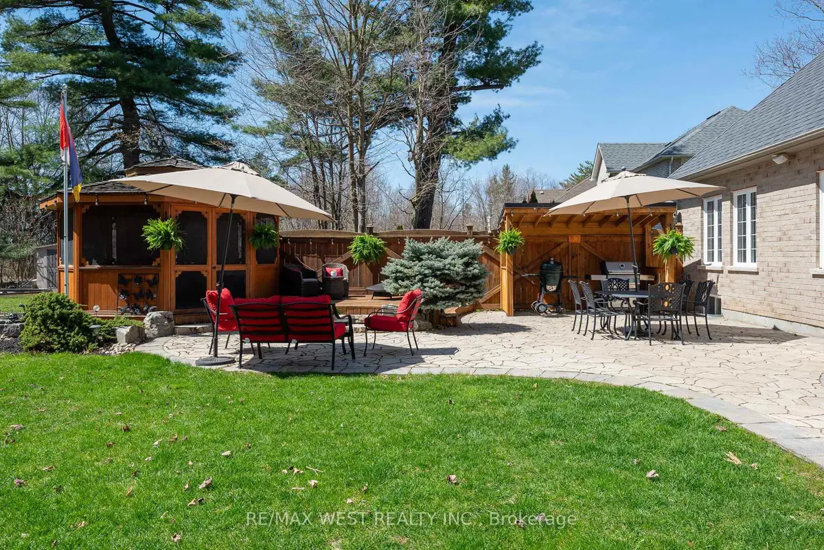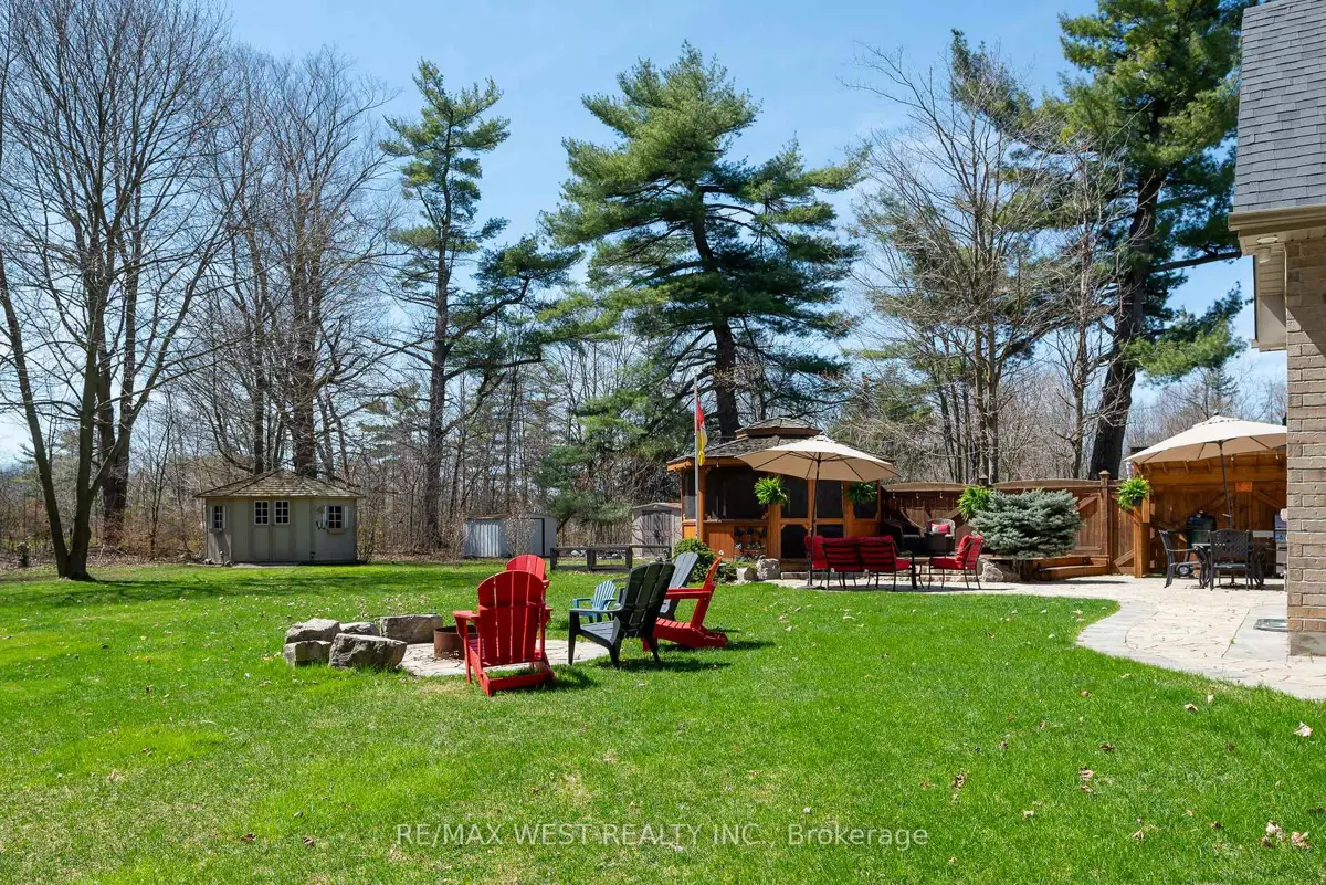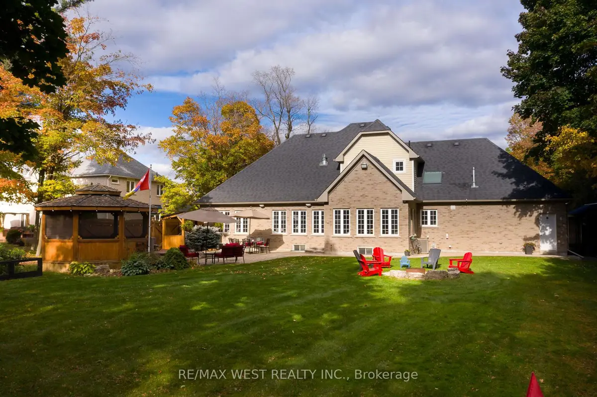 A Custom-Built Masterpiece in the Heart of Erin! This bungaloft offers over 4,300 sq ft of total living space, blending refined craftsmanship with everyday comfort. Pride of ownership is evident in every detail from the hand-stained hardwood floors to the thoughtfully designed indoor and outdoor living spaces. The chef-inspired kitchen features upgraded solid wood cabinetry, a new LG fridge, double oven, gas cooktop, wine fridge, and large centre island perfect for gathering with family & friends. The adjoining dining & sitting areas share a stunning two-way gas fireplace. Step outside to discover your private retreat complete with a sheltered BBQ area(with two gas lines), screened-in gazebo with powered lighting and ceiling fan, multiple seating areas, elegant fence-line lighting, rough-in for future hot tub, and a fire pit with wood storage all overlooking the tranquil pond beyond. The living room offers cathedral ceilings, a second view of the two-way fireplace, and surround sound system that extends to the patio for effortless indoor-outdoor entertaining. The main floor primary suite is a true haven, featuring a spa-like 5-pc ensuite with soaker tub, walk-in shower, double sinks, and walk-in closet. The main level also includes a stylish home office, 2-piece bath, and convenient laundry room with access to the 4-car insulated garage divided into two sections, including a heated area. Upstairs, you'll find three beautifully appointed bedrooms and a 5-pc bath ideal for family or guests. The lower level is designed for year-round enjoyment, featuring a games area, wet bar, home theatre with surround sound, gym, 3-piece bath, gas fireplace, and custom lighting. This remarkable home is within walking distance to boutique shops, restaurants, the high school, parks, trails, & more. A Generac generator powers most of the home, offering peace of mind without compromise. A rare opportunity to own a home that perfectly balances luxury, functionality, and small-town charm.